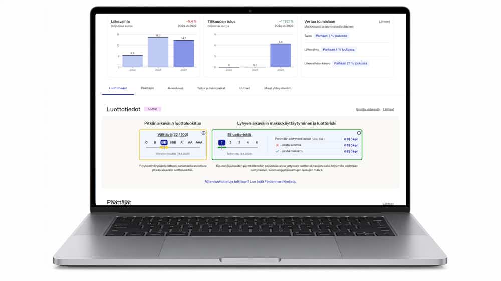 ”Vaikka suurimmalla osalla Suomen yrityksistä on hyvä maksukyky, kumppaneiden ja yritysasiakkaiden luotto- ja perintätietojen tarkistamisen tulisi olla osa päivittäistä liiketoimintaa. Perintätiedot ennakoivat yritysten maksuongelmia jo paljon ennen esimerkiksi maksuhäiriömerkintöjä, ja niiden avulla luottoriskejä voi vähentää oleellisesti. Halusimme tuoda nämä tiedot Finderiin, jotta kaikenkokoiset yritykset voivat jatkossa tarkistaa asiakkaidensa luottotiedot helposti ja edullisesti”, toteaa Kultala.