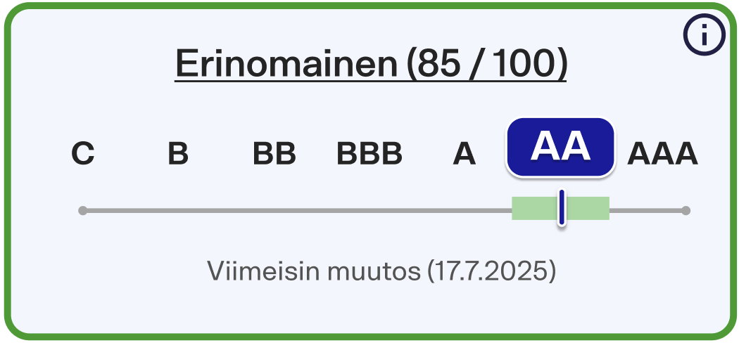 - Luottoluokitus antaa tietoa yrityksen maksukyvystä ja luottoriskistä. Luottoluokitus lasketaan luottoluokituspisteiden perusteella vuosittain tilinpäätöstietojen julkaisun yhteydessä. Luottoluokitustiedot tarjoaa Valuatum.