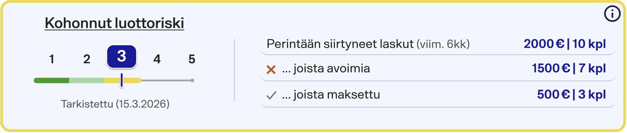 Riskitaso kuvaa yrityksen maksukykyyn liittyvää luottoriskiä. Se perustuu Intrumilla perinnässä oleviin riidattomiin saataviin sekä yritysten kokoon. Riskitaso heijastaa osaltaan yritysten taloudellista tilaa.