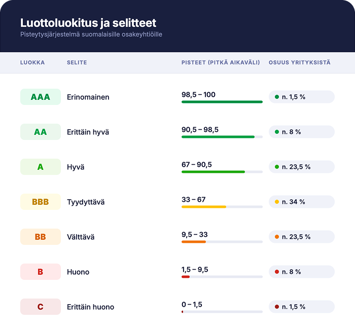 - Luottoluokituspisteet muunnetaan luottoluokiksi (C-AAA) vertaamalla yrityksen luottoluokituspisteitä kaikkien osakeyhtiöiden keskiarvoon pitkällä aikavälillä. Mitä suurempi ero keskiarvoon, sitä korkeampi tai matalampi luokitus. Suurin osa yrityksistä saa luottopisteiden perusteella keskitason luokituksen.